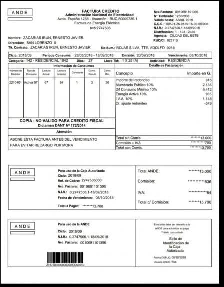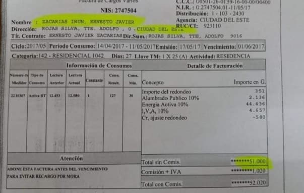 La factura es de una casa de Ciudad del Este, ubicada en el barrio Pablo Rojas, y el monto por el ciclo de consumo del 14 de abril de 2017 al 11 de mayo de 2017 es de solo G. 52.020. Según las autoridades, la misma está deshabitada.