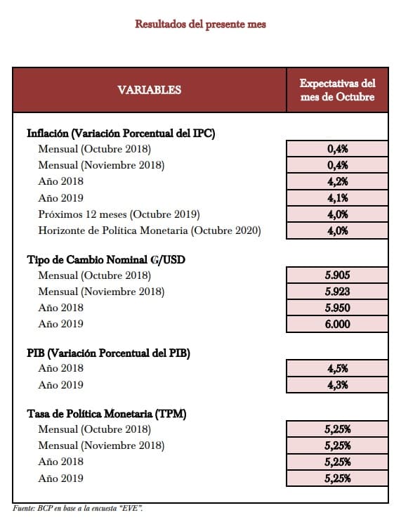 Los datos son arrojados por la encuesta que se realiza por la Banca Matriz a un panel representativo de los principales sectores económicos que incluyen a bancos, financieras, calificadoras de riesgo, casas de bolsa, empresas consultoras, analistas independientes, organizaciones económicas y universidades.