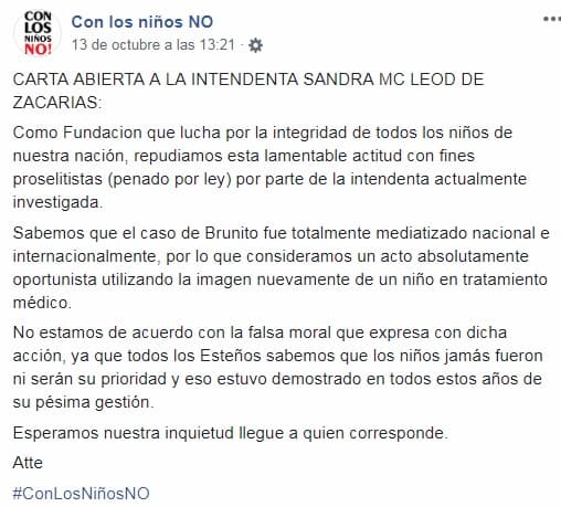 “Como Fundación que lucha por la integridad de todos los niños de nuestra nación, repudiamos esta lamentable actitud con fines proselitistas (penado por ley) por parte de la intendenta actualmente investigada. Sabemos que el caso de Brunito fue totalmente mediatizado nacional e internacionalmente, por lo que consideramos un acto absolutamente oportunista utilizando la imagen nuevamente de un niño en tratamiento médico”.