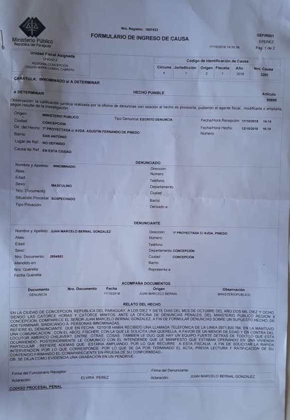 Reveló además que Alejandro Urbieta (PLRA), intendente de Concepción, lo intimó para que no filtre nada del caso, debido a ello presentó una denuncia ante el Ministerio Público contra personas innominadas.