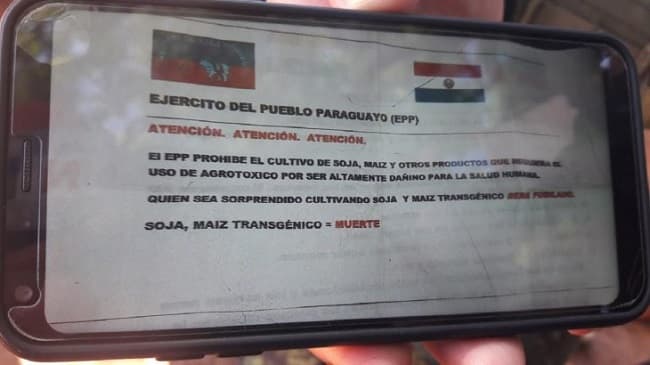 Un panfleto del Ejército del Pueblo Paraguayo (EPP) fue hallado por pobladores de San Pedro. En el texto el grupo criminal reitera su amenaza de muerte a quienes cultivan soja y maíz transgénico.
