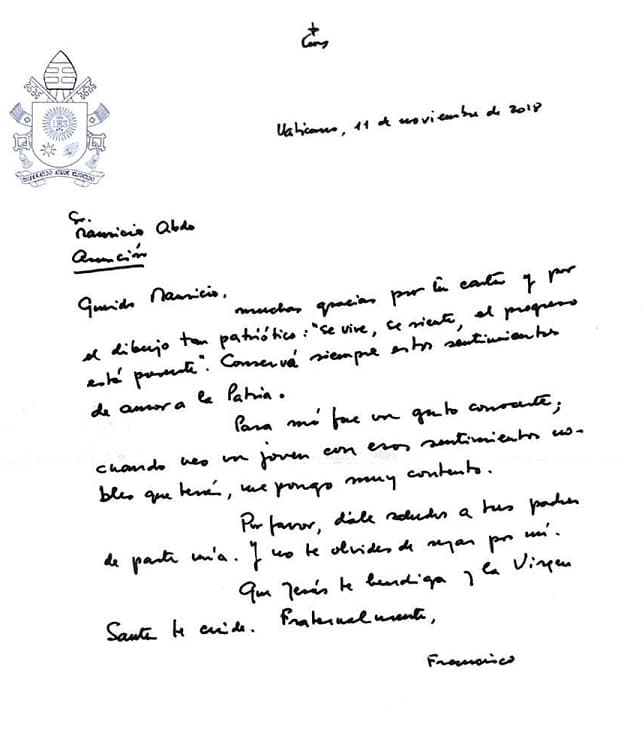 “Querido Mauricio, muchas gracias por la carta y por el dibujo tan patriótico: “Se vive, se siente, el progreso está presente”. Conservá siempre estos sentimientos de amor a la Patria. Por favor, dále saludos a tus padres de parte mía. Y no te olvides de rezar por mí. Que Jesús te bendiga y la Virgen Santa te cuida”, expresó en otra parte de la carta.