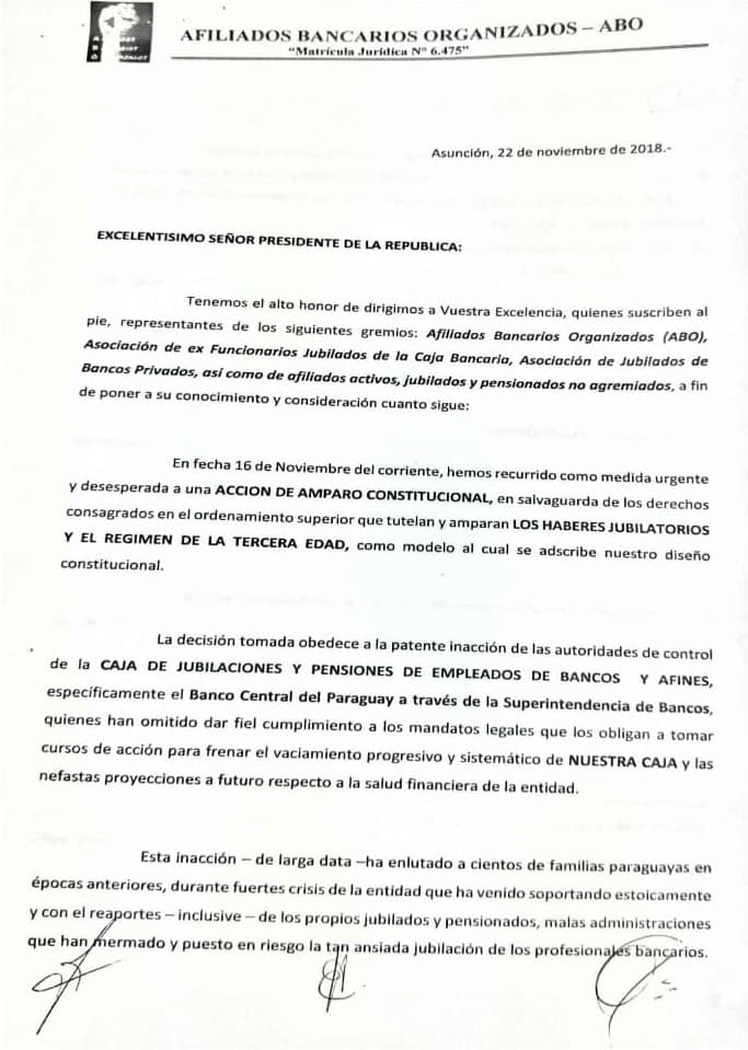 La nota manifiesta, además, que los firmantes recurrieron a un amparo constitucional para cuidar los haberes jubilatorios y el régimen de la tercera edad.