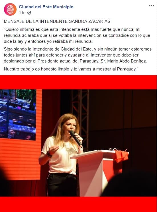 Sigo siendo la Intendente de Ciudad del Este, y sin ningún temor estaremos todos juntos ahí para defender y ayudarle al Interventor que debe ser designado por el Presidente actual del Paraguay, Sr. Mario Abdo Benítez.