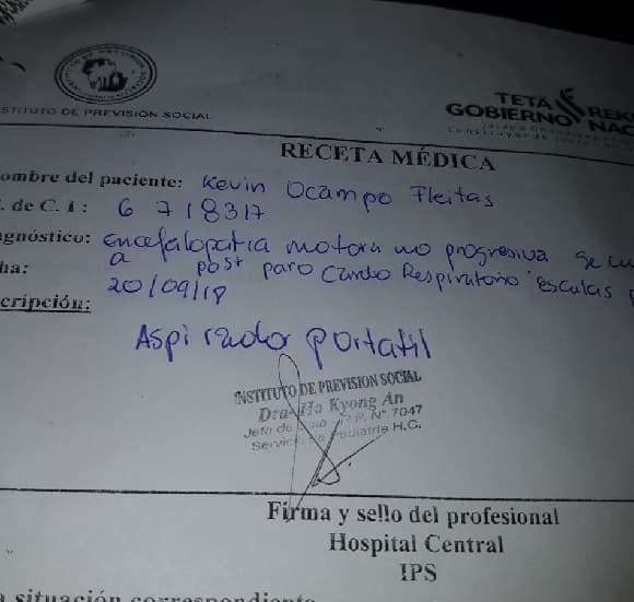 De acuerdo a los relatos de la madre, Betty Fabiola Ocampo Fleitas, Kevin fue trasladado hasta el hospital de Itauguá por un supuesto cuadro de alergia, en enero de este año. Sin embargo los procedimientos realizados no dieron resultados y su situación se complicó de un momento a otro. Al ver que el joven empeoraba su situación, los médicos resolvieron enviarlo hasta el Hospital Central del Instituto de Precisión Social (IPS). Según comentó la madre, ingresó a terapia intensiva prácticamente de inmediato. Luego de varios estudios, los profesionales llegaron a la conclusión que se trata de una enfermedad llamada Guillain-Barré. La misma afecta al sistema nervioso. Kevin estuvo seis meses en terapia intensiva y tres meses en sala. Lo sorprendente para sus familiares y allegados es el cambio rotundo que generó la enfermedad y el daño que causó en tan poco tiempo. Desiree Fleitas Recalde, amiga de la madre manifestó que la situación es bastante complicada para la familia, ya que son de escasos recursos, viven en un asentamiento en Itá y sólo Betty está a cargo del hogar.