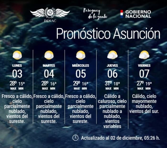La temperatura máxima para Asunción será de 27ºC, mientras que en Ciudad del Este se espera una temperatura de 28ºC y en Encarnación llegará a los 25ºC. En el Chaco la máxima llegará a los 30ºC.