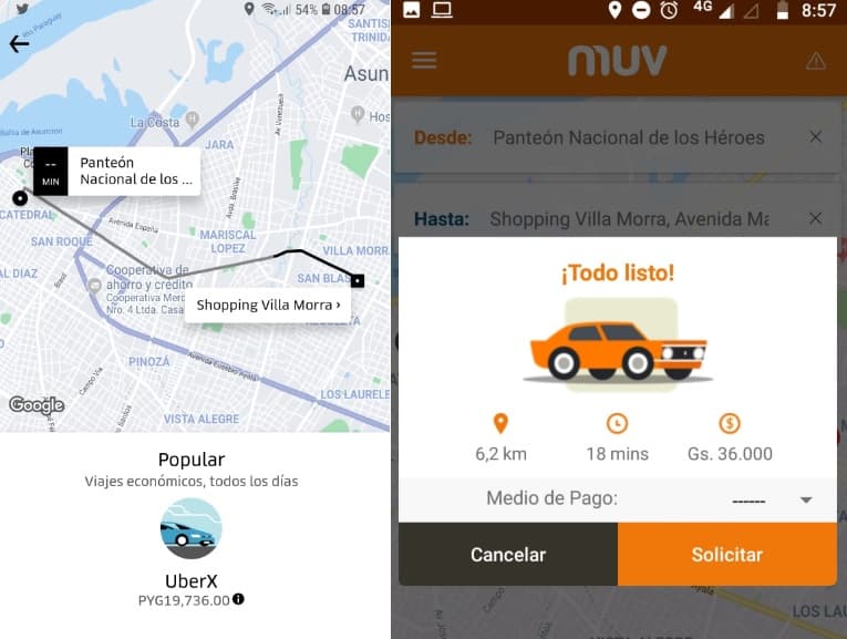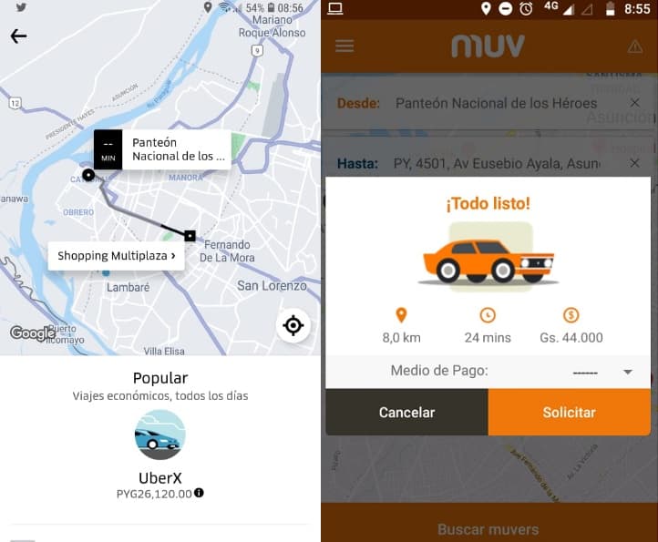 Actualmente, Muv ya brindaba el servicio en Asunción y alrededores, desde este jueves Uber cuenta con la misma facilidad.
