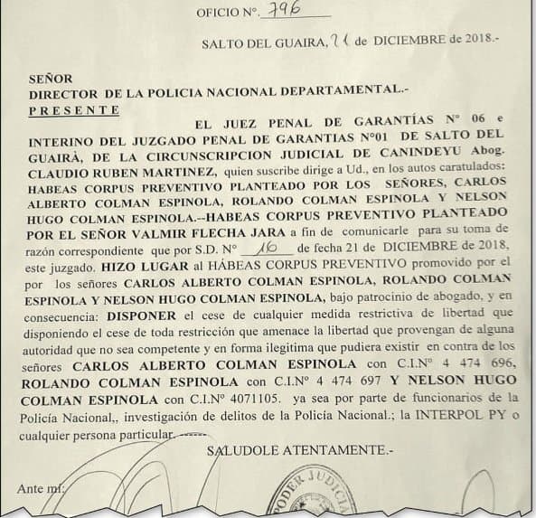 El juez penal de garantías de Salto del Guairá, Claudio Rubén Martínez, emitió un fallo el pasado viernes 21 mediante el cual ordena a la Policía Nacional que no moleste a tres presuntos contrabandistas de Canindeyú, que son los hermanos Carlos Alberto Colmán Espínola, Rolando Colmán Espínola y Nelson Hugo Colmán Espínola.