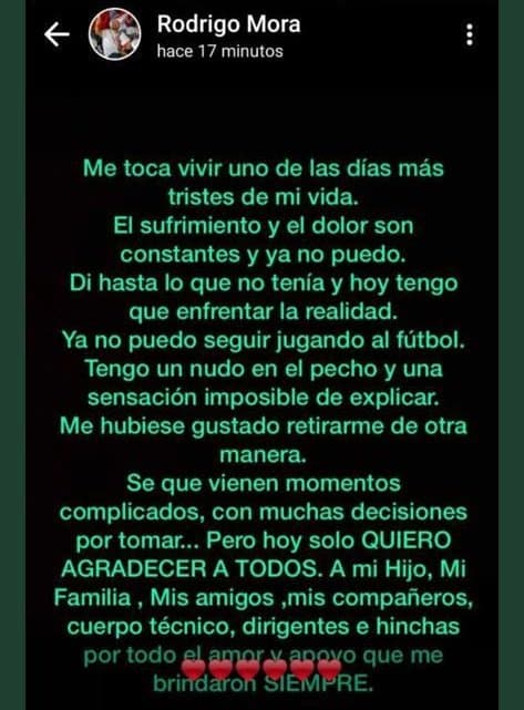 El anunció lo realizó “Morita” en horas de la noche del domingo, a través de las redes sociales. En su despedida se puede leer que deja la práctica del fútbol asegurando: “El sufrimiento y el dolor son constantes y ya no puedo”.