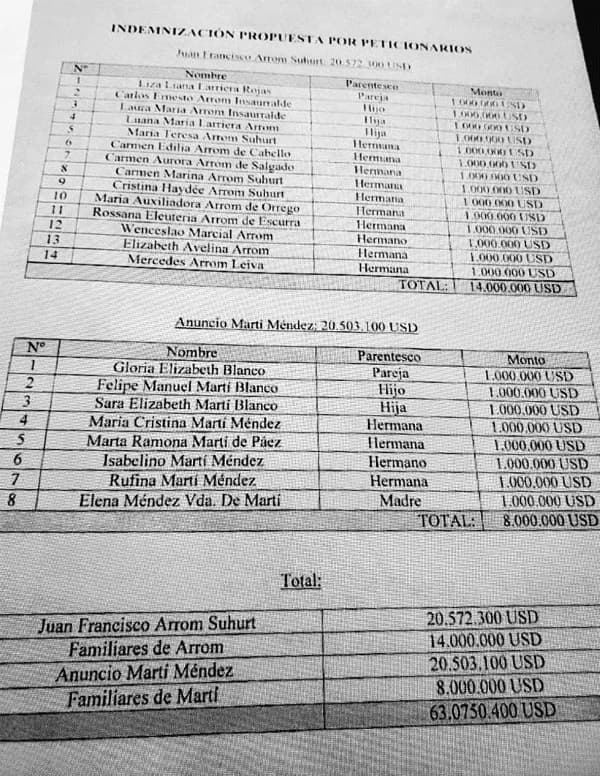 La suma de lo solicitado llega a más de USD 63 millones, que beneficiaría además de Juan Arrom y Anuncio Martí, a sus familiares y abogados.