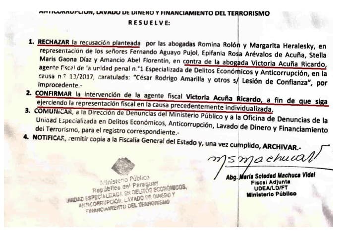 "La penosa resolución de la fiscal adjunta Soledad Machuca, que pretende 'blanquear' a Victoria Acuña, ya fue impugnada ante la Corte Suprema De Justicia, quien hará justicia y rectificará las intenciones equivocadas de algunos integrantes del Ministerio Público”.