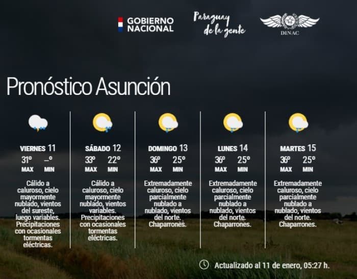 Según el meteorólogo de turno, Carlos Santacruz, el inicio del fin de semana arrancará con marcas térmicas no muy elevadas debido a la nubosidad y a las lluvias previstas para este viernes, el alto contenido de humedad favorecerá a que el ambiente se torne algo incómodo durante ciertos momentos del día.