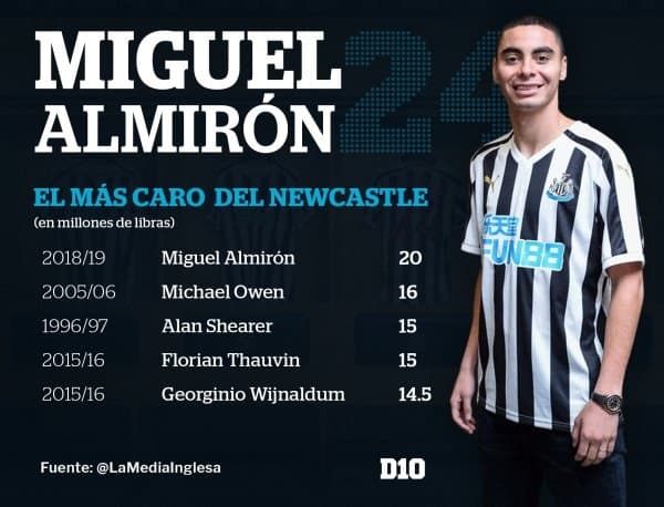 El Newcastle United, de la Premier League, anunció al futbolista paraguayo Miguel Almirón como el fichaje más caro de la historia del club.