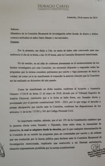 En una parte del texto, Cartes indica que "la Constitución establece que la persona electa como senador o diputado tiene, entre otras, la inmunidad de detención, la cual se adquiere desde la elección, por lo que cualquier determinación de la comisión de no remitir las preguntas para ser contestadas por escrito”.