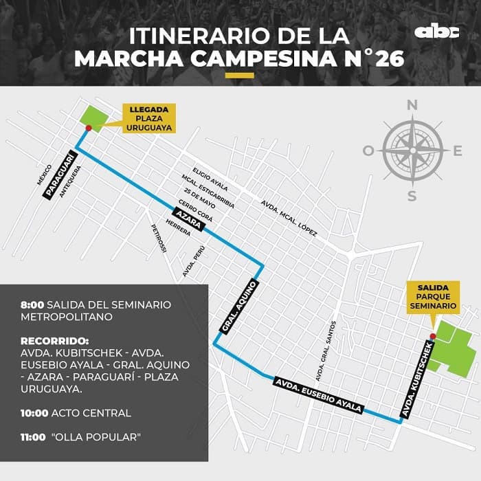 De acuerdo a lo informado por ABC Color, los labriegos realizarán su recorrido desde el ex Seminario Metropolitano hasta la plaza Italia, por lo que habrá desvíos en las zonas afectadas.