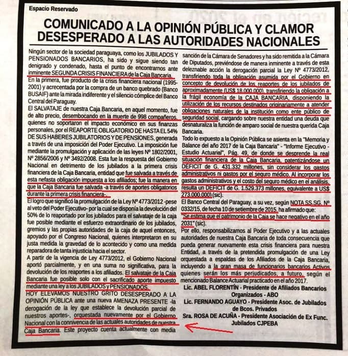 Todo lo que se expone en el comunicado se encuentra sentado en la “Memoria y Balance del año 2017 de la Caja Bancaria”, “Informe Ejecutivo - Estudio Actuarial”, Pág. 49, de donde se desprende la real situación financiera de la Caja Bancaria patentizándose un DEFICIT de G. 431.332 millones sin considerar los Gastos Administrativos ni Gastos por el Seguro Médico.