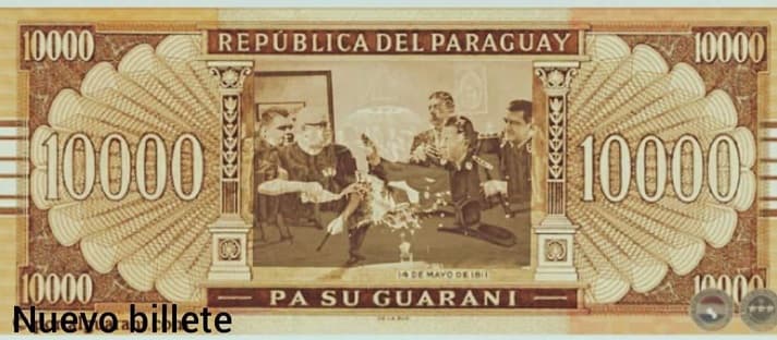 Un magistral montaje, del billete de G. 10.000 con la polémica escena retratada.