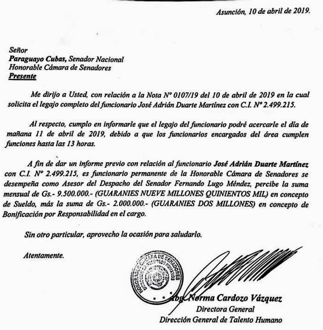 Por otra parte, la nota que fue firmada por la abogada Norma Cardozo Vázquez, directora de Talento Humano de la Cámara Alta, detalla que el hombre que se enfrentó a Payo Cubas el pasado martes, se llama José Adrián Duarte Martínez y trabaja en el Senado como asesor de Lugo.