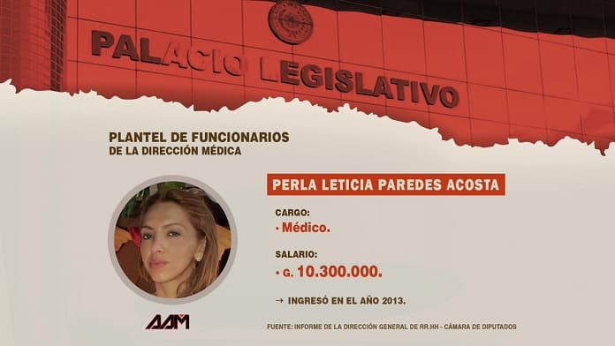 Perla Leticia Paredes Acosta, más conocida como “Perlita”, fue conocida por ser la hija de la exdiputada Perla De Vázquez. Ella ostentaba cinco cargos, en el IPS, Ministerio de Salud, Itaipú, Diputados y hasta en la Corte Suprema de Justicia. En su momento la consulta que surgió es ¿cómo podía cumplir con todo?. Fue procesada y condenada.