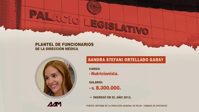 Sandra Stefani Ortellado Garay es la “famosa” nutricionista, exasistente del diputado Edgar Ortiz. En su momento se supo que asiste solo dos veces por semana a su lugar de trabajo. Ingresó en 2012 y su salario es de G. 8,3 millones.