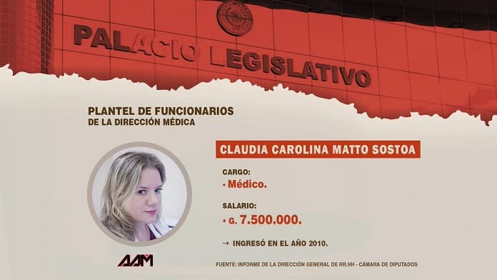 Claudia Carolina Matto Sostoa figura como una de las médicas de la dependencia y gana al mes G. 7,5 millones. Accedió al cargo en 2010.