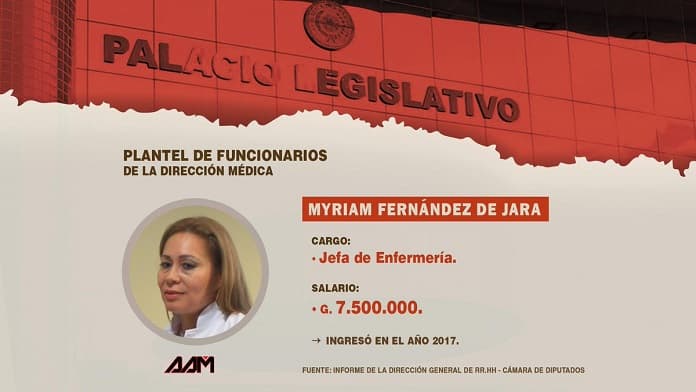 La jefa de enfermería, Myriam Fernández de Jara, gana al mes G. 7,5 millones. Ingresó a la Cámara Baja en 2017.