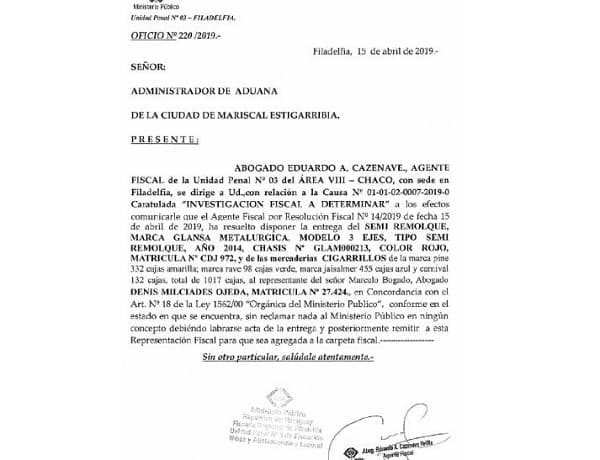 Por su parte, la Dirección Nacional de Aduanas (DNA) cotejó la información brindada por el abogado Denis Ojeda, en representación de Marcelo Bogado, dueño de la carga de cigarrillos que había sido retenida en principio, pero que en la Administración Aduanera de Mariscal Estigarribia se procedió luego a devolver el semirremolque que contenía las mercaderías a su propietario, por orden del agente fiscal Eduardo Cazenave, de la Unidad Penal número 3 del Chaco.