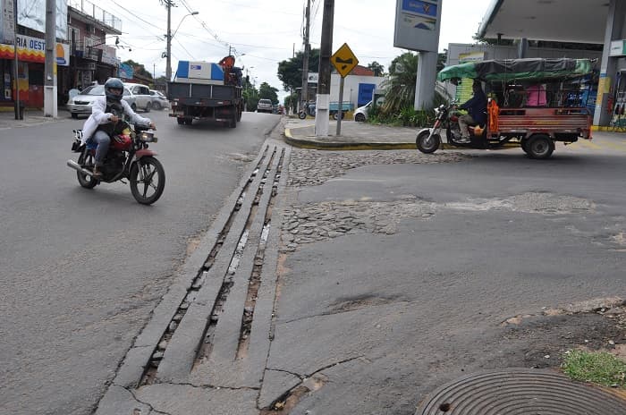 Las motos tampoco se salvan de los baches, en este tipo de sitios los conductores de biciclos están en peligro. Instantánea de San Isidro y Carretera de López.