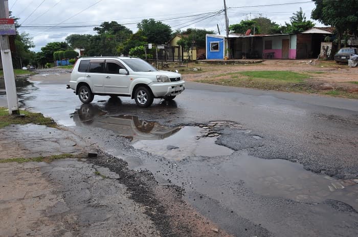 Vehículos no pueden evitar pasar por los profundos baches y corriendo el peligro de sufrir daños. También Avenida Cacique Lambaré, esta vez en su cruce con Jakaré Valija.