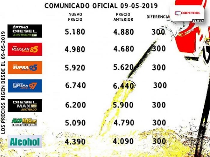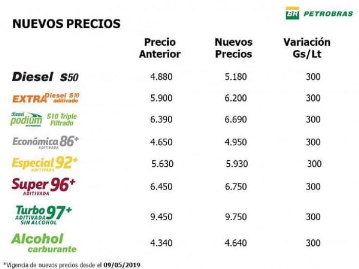 Según informó Última Hora, los emblemas Copetrol, Barcos y Rodados y Petrobras confirmaron, este jueves, oficialmente que incrementaron los precios de sus combustibles G. 300 más, que afectará al gasoil común, el Premium y las naftas común, de 90-92 octanos y la súper de 95-96 octanos.