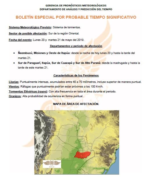 En tanto que los los departamentos directamente afectados serán; Ñeembucú, Misiones y el oeste de Itapúa; mientras que el sur de Paraguarí, el resto de Itapúa, el sur de Caazapá y el sur de Alto Paraná estarán bajo la zona de influencia desde la madrugada del martes.