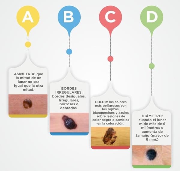 Un forma práctica para detectar un melanoma es la “regla del ABCD”, la cual consiste en observar las siguientes características: