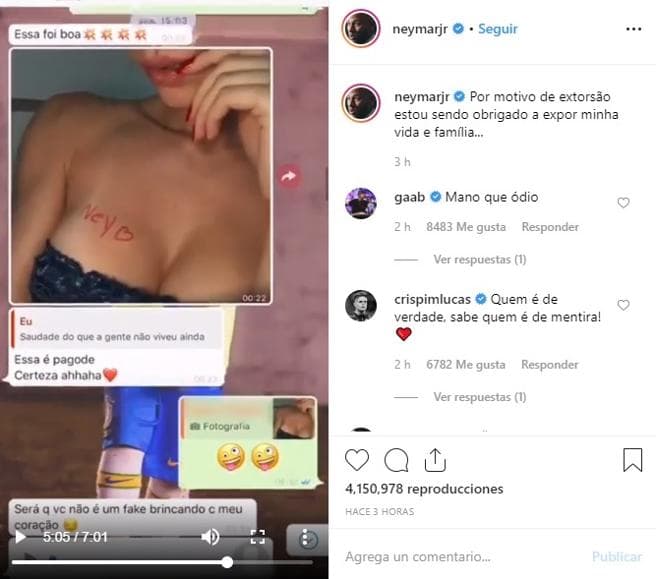 El delantero brasileño Neymar divulgó este domingo en sus redes sociales los mensajes íntimos de la mujer que lo denunció por violación.