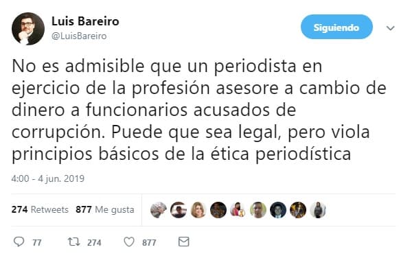 “No es admisible que un periodista en ejercicio de la profesión asesore a cambio de dinero a funcionarios acusados de corrupción. Puede que sea legal, pero viola principios básicos de la ética periodística”, tuiteó el periodista Luis Bareiro sobre un audio en el que se escucha a Lezcano hablar de publicaciones sobre el intendente de Concepción Alejandro Urbieta.