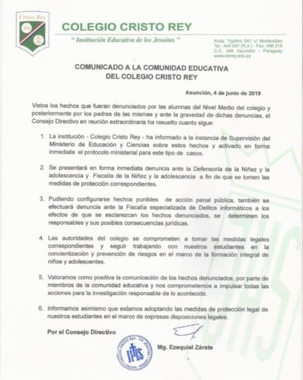 Luego de la polémica, el consejo directivo del Colegio Cristo Rey emitió un comunicado en el se compromete a tomar las medidas legales correspondientes, y a trabajar con los estudiantes en la concientización y prevención de este y otro tipo de riesgos.