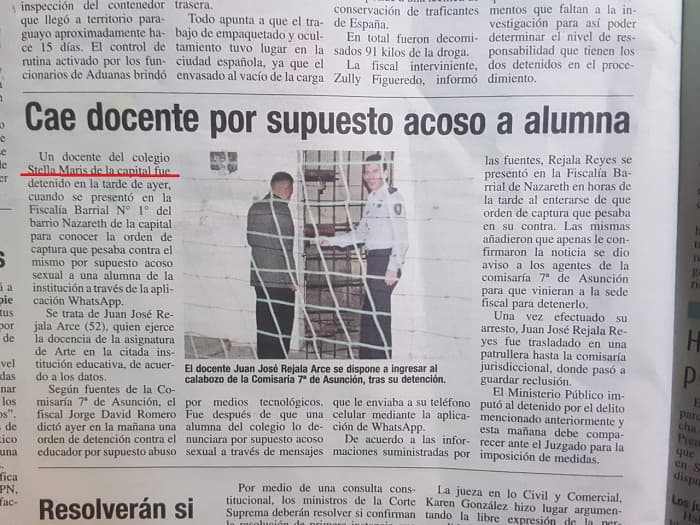 El pasado 7 de junio, varios medios publicaron que un docente, identificado como Juan José Rejala Arce, de 52 años, fue acusado por supuesto acoso sexual por medios tecnológicos. Según la publicación, el profesor enseñaba la asignatura de Artes, en el Colegio Nacional Stella Maris, y que una alumna de dicha institución realizó la denuncia.
