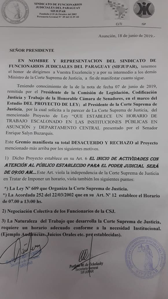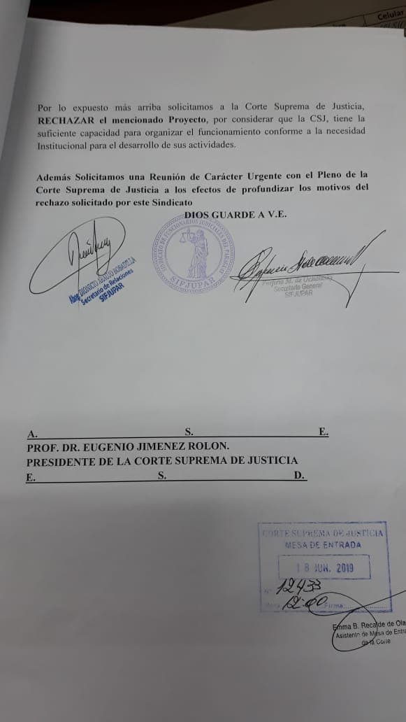 Este martes, el Sindicato de Funcionarios Judiciales del Paraguay (Sifjupar) envió una nota al presidente de la Corte Suprema de Justicia, el ministro Eugenio Jiménez Rolón, para comunicar su oposición a la propuesta impulsada por el legislador liberal mencionado.