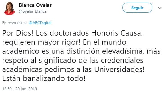 “Por Dios! Los doctorados Honoris Causa, requieren mayor rigor! En el mundo académico es una distinción elevadísima, más respeto al significado de las credenciales académicas pedimos a las Universidades! Están banalizando todo!”, tuiteó.