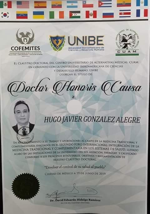 “Doctor Honoris Causa a Hugo Javier González Alegre, en reconocimiento a su trabajo y aportaciones al campo de la medicina tradicional y complementaria en los sistemas de salud”, se lee en el cartón y la placa entregadas.
