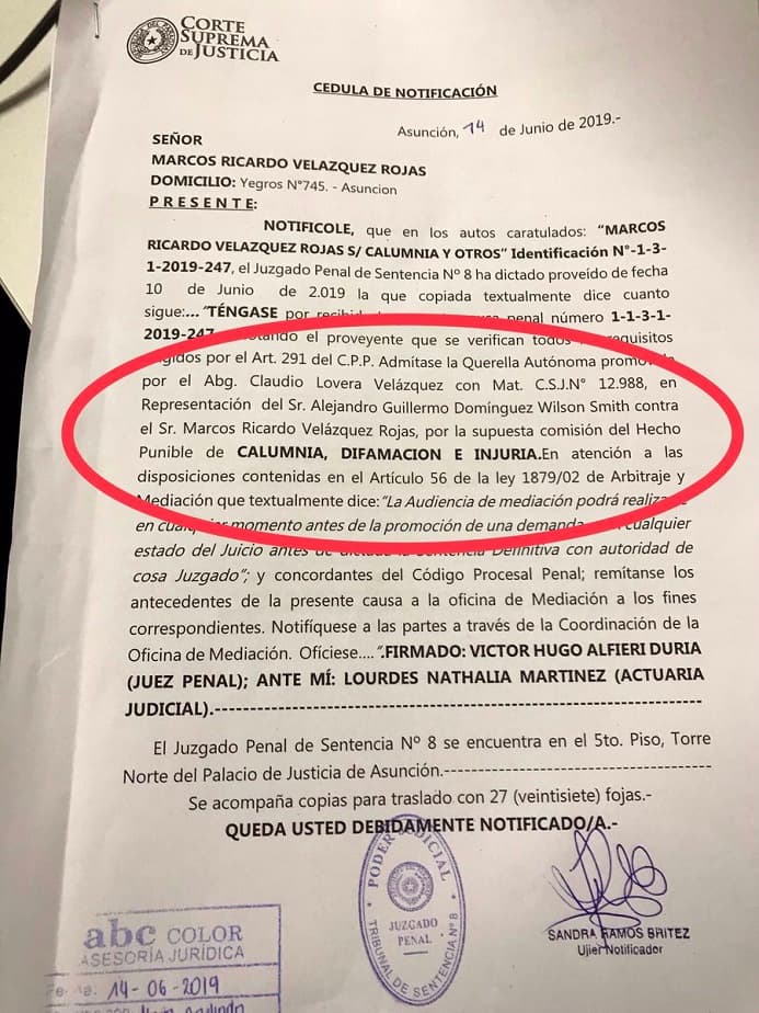 El documento fue fechado el 14 de junio pasado y el periodista del diario ABC Color ya fue notificado, como se puede ver en la imagen de abajo.