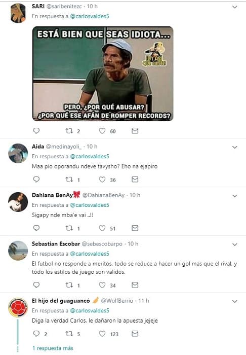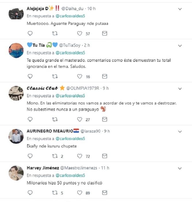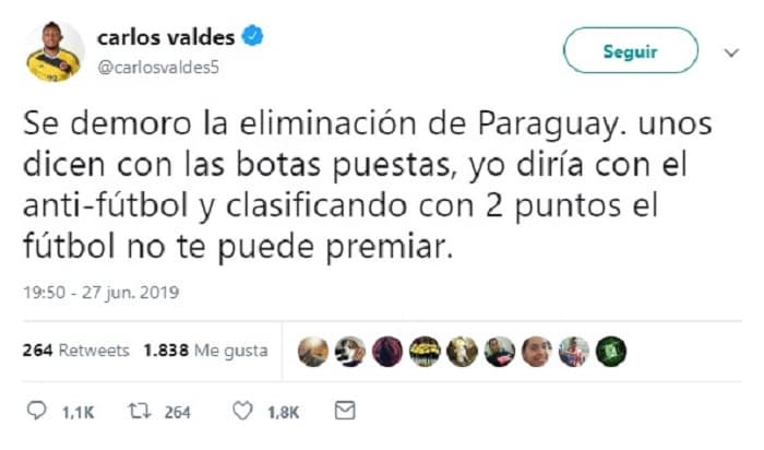 El defensor colombiano de América de Cali, Carlos Valdés, atacó a la Albirroja, desde su cuenta de Twitter y afirmó que Paraguay no merecía pasar a la semifinal de la Copa América.