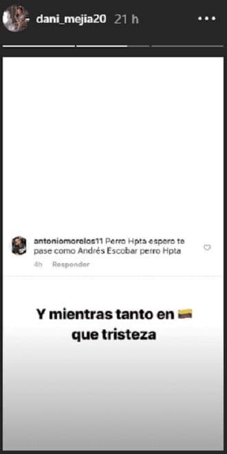 "Y mientras tanto (bandera de Colombia) que tristeza" y señaló: "Dios les de paz, acá me quedaría toda la mañana publicando las amenazas hacia mi esposo y hacia nosotros. Una lástima", reza una parte de la nota de Mejía.