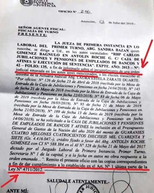 El Juzgado de Primera Instancia en lo Laboral del Primer Turno, a cargo de la Abogada Sandra Bazán, en los autos “RHP Carlos Giménez Bagnulo en Antolín Roche c/Caja de Jubilaciones y Pensiones de Empleados de Bancos y Afines s/Ejecución de Sentencia”; ante el incumplimiento de una orden judicial por parte de la Caja Bancaria, informó al Ministerio Publico a fin de dar cumplimiento a lo establecido en el Art. Nº 1.