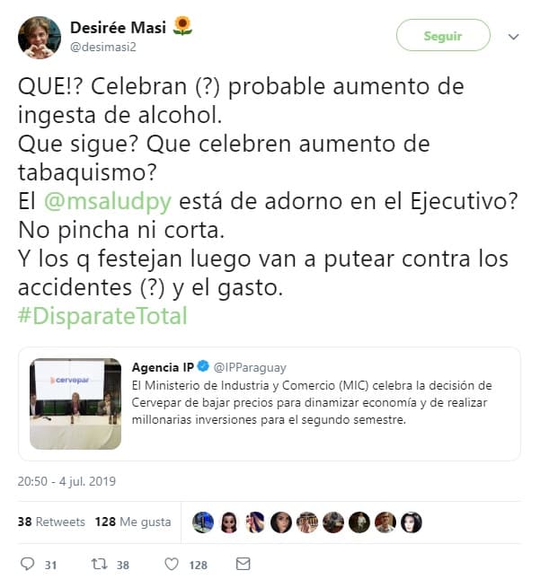 “QUE!? Celebran (?) probable aumento de ingesta de alcohol. Que sigue? Que celebren aumento de tabaquismo? El @msaludpy está de adorno en el Ejecutivo? No pincha ni corta. Y los q festejan luego van a putear contra los accidentes (?) y el gasto. #DisparateTotal”, tuiteó Masi demostrando su disgusto.