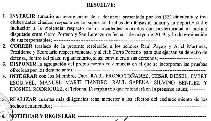 Unos 53 clubes afiliados a la Asociación Paraguaya de Fútbol (APF) denunciaron a Cerro Porteño, aparentemente, por los desmanes que se registraron una vez acabado el partido entre el Ciclón y el Sportivo San Lorenzo, por la Fecha 19 del Apertura.