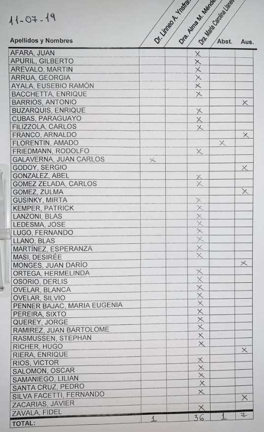 Linneo Ynsfrán recibió el voto de un solo legislador, del veterano Juan Carlos Galaverna. Por su parte, Alma Méndez, se quedó sin votos.