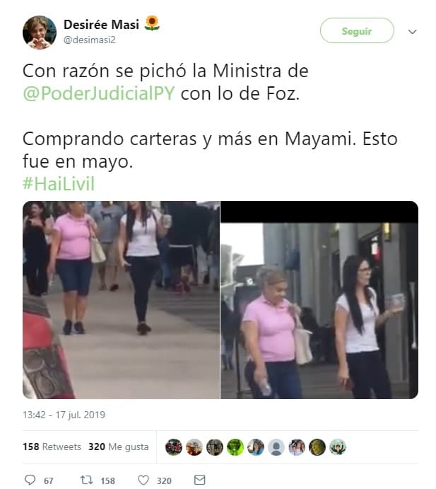 “Con razón se pichó la Ministra de @PoderJudicialPY con lo de Foz. Comprando carteras y más en Mayami. Esto fue en mayo. #HaiLivil”, publicó la senadora en Twitter.