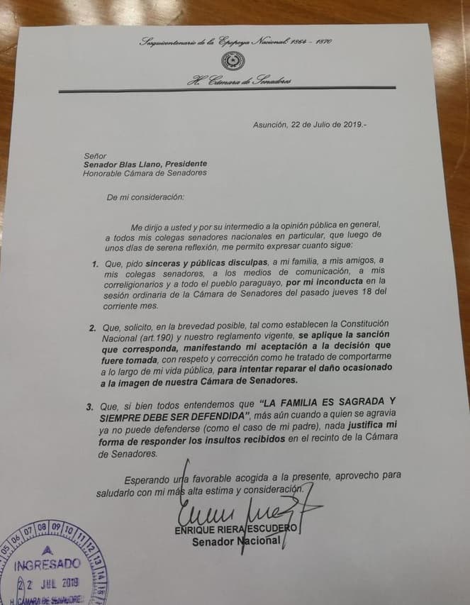 Mediante una nota presentada este lunes a la Mesa Directiva del Senado, Riera pidió disculpas por su reacción ante agresiones verbales de su colega Paraguayo Cubas, durante la sesión ordinaria del jueves.