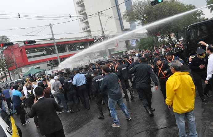 Cerca de las 10:00 se dio la represión más importante. Policías usaron sus carros hidrantes y abrieron fuego con balines de goma contra los manifestantes.