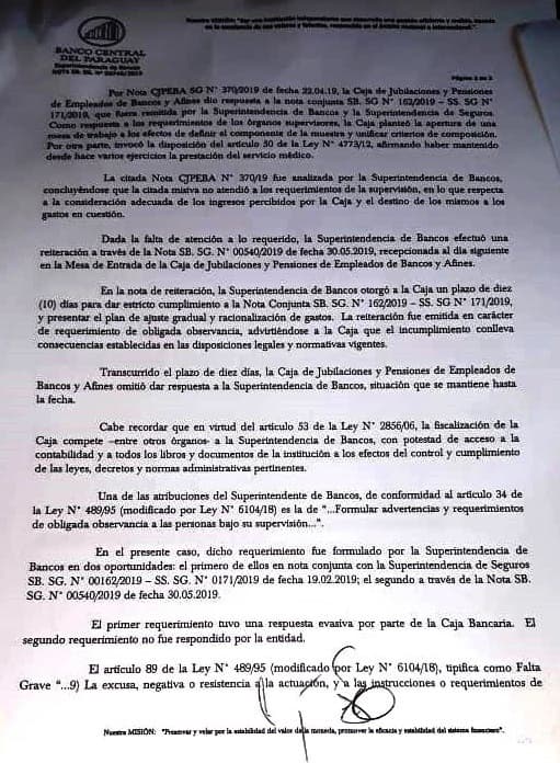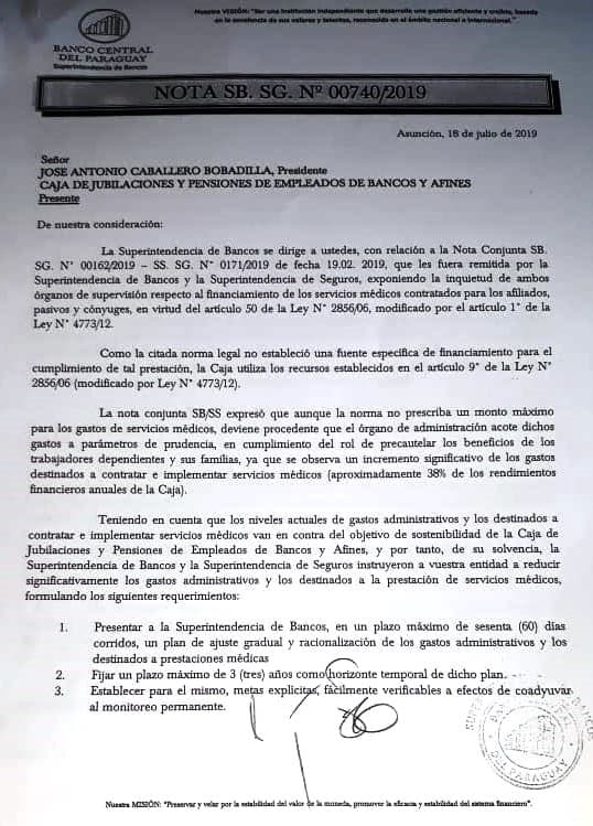 Ante una primera respuesta evasiva a requerimientos formulados por la Superintendencia de Bancos y la Superintendencia de Seguros, dependencias del BCP, la Banca Matriz indicó que los niveles de gastos administrativos y los destinados a contratar e implementar servicios médicos van en contra del objetivo de sostenibilidad y la solvencia de la Caja Bancaria.